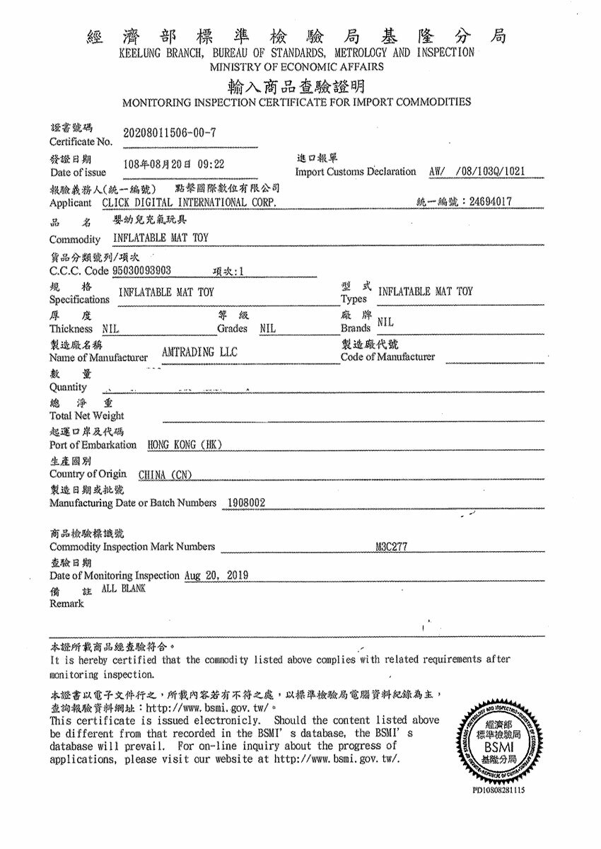 本商品係塑膠材質,生產包裝後,經封裝及運輸過程,會累積氣味為正常現象,如對氣味敏感者,可清洗並置於通風處數天即自然散去,商品正式報關進口,並取得經濟部標準檢驗局之輸入商品查驗證明。