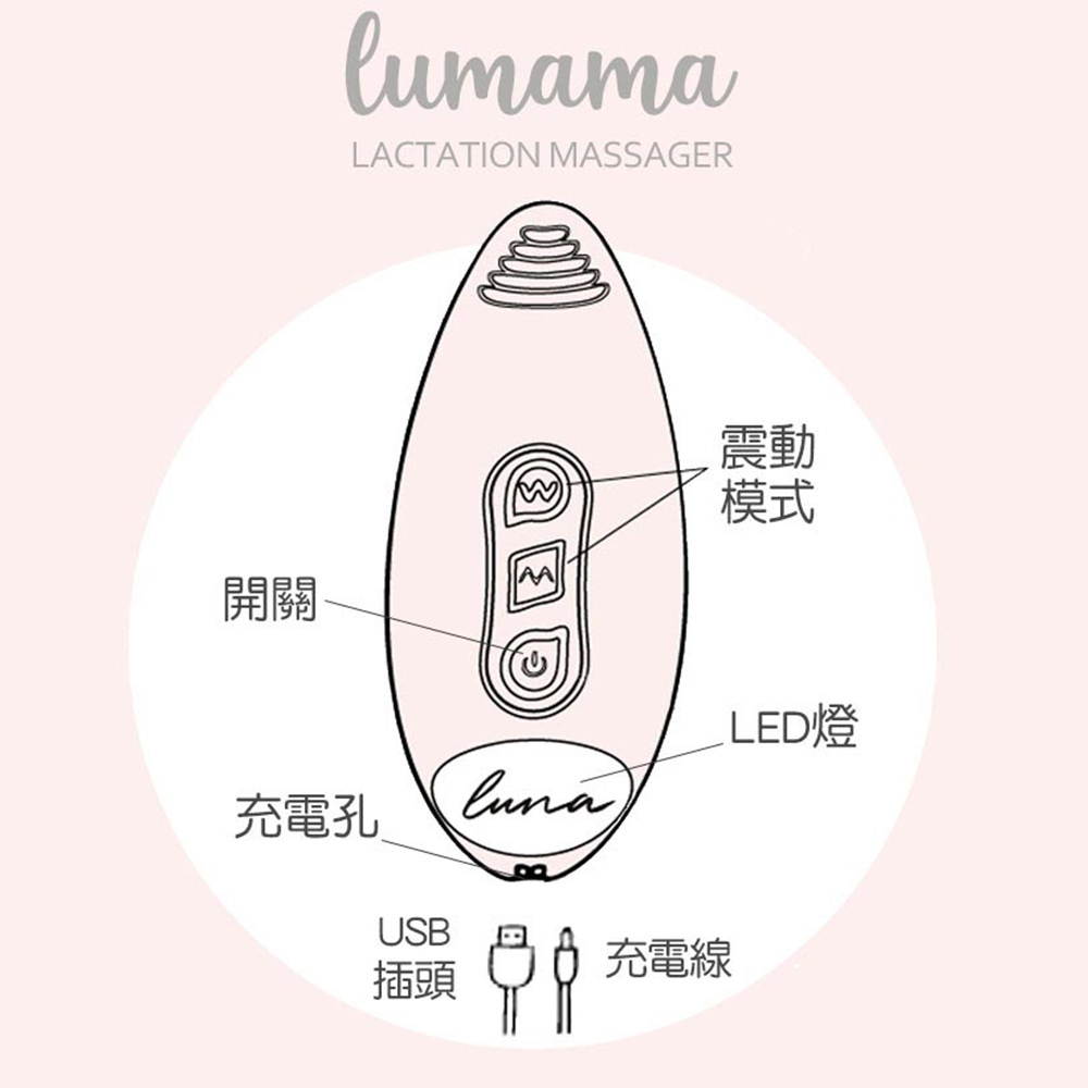 3.本產品並非醫療器材,無治療、檢測等功能,僅為手持輔助按摩乳房工具。乳房若有不適,請諮詢醫療專業人士或泌乳顧問。