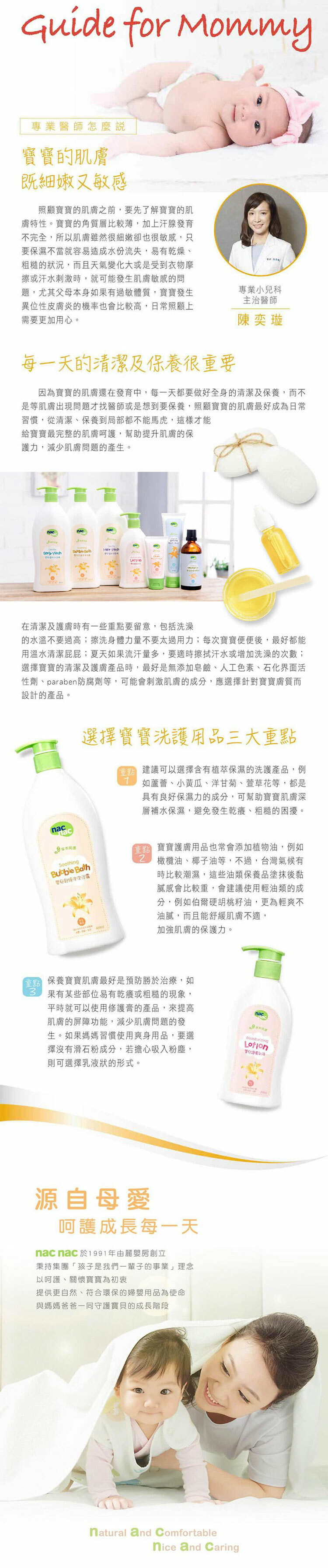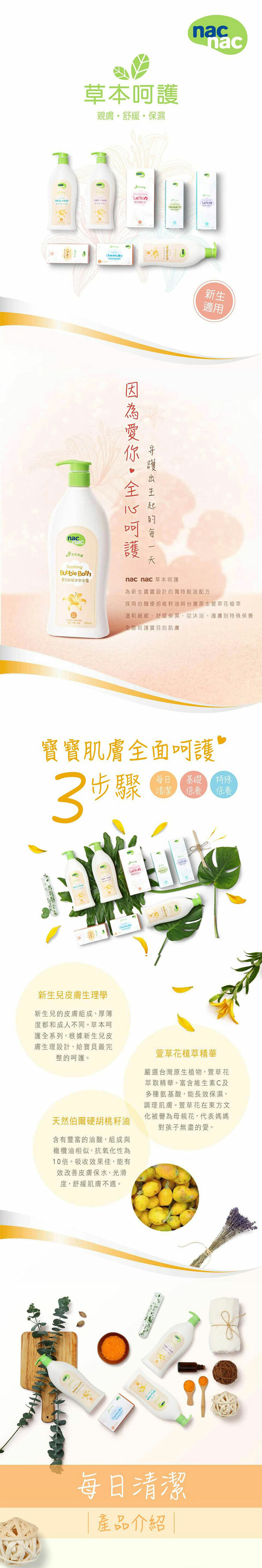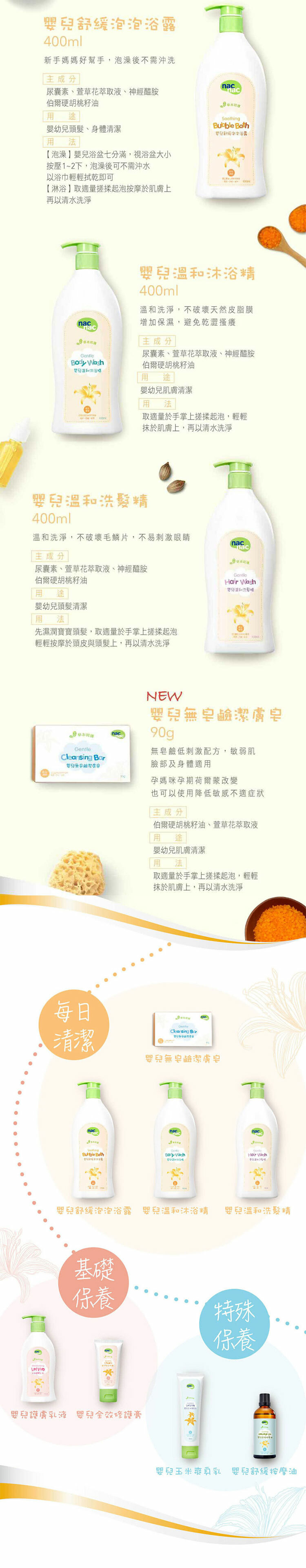 ▸Nac Nac草本呵護嬰兒舒緩泡泡浴露:尿囊素、萱草花萃取液、神經胺酸、伯爾硬胡桃籽油