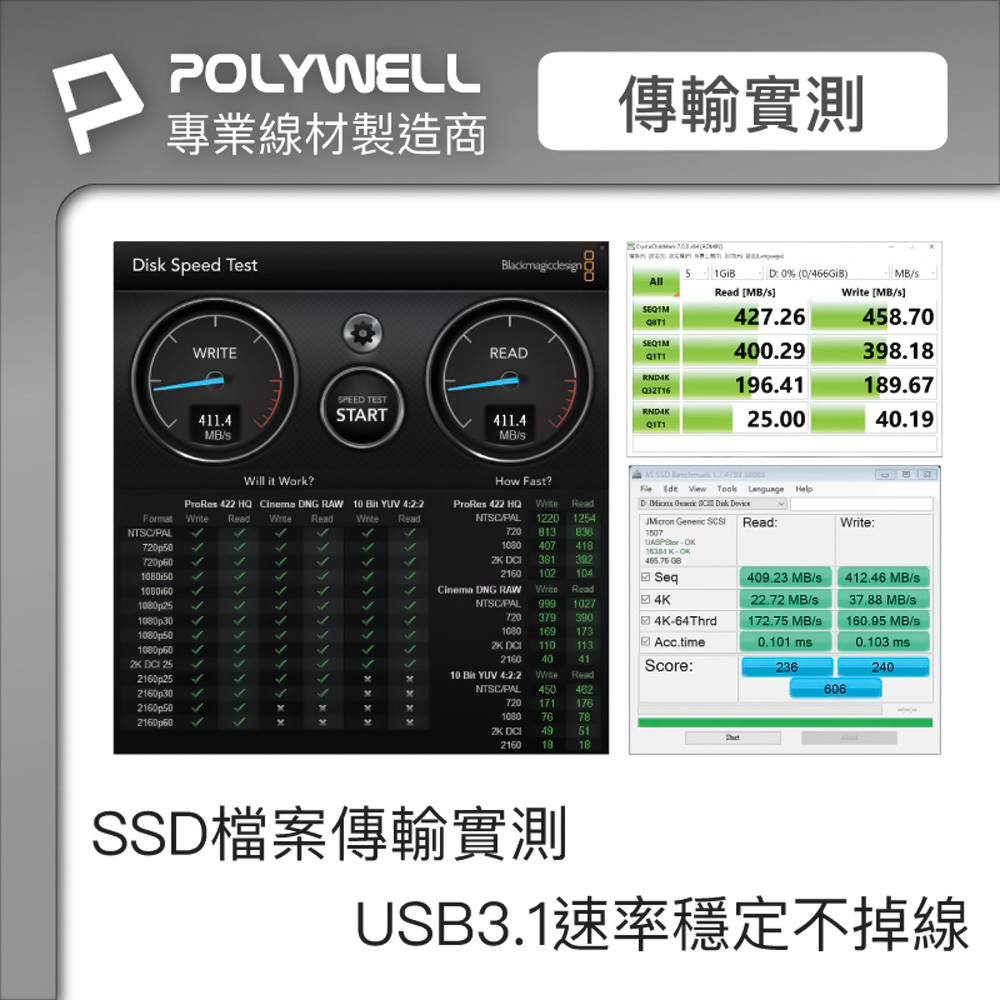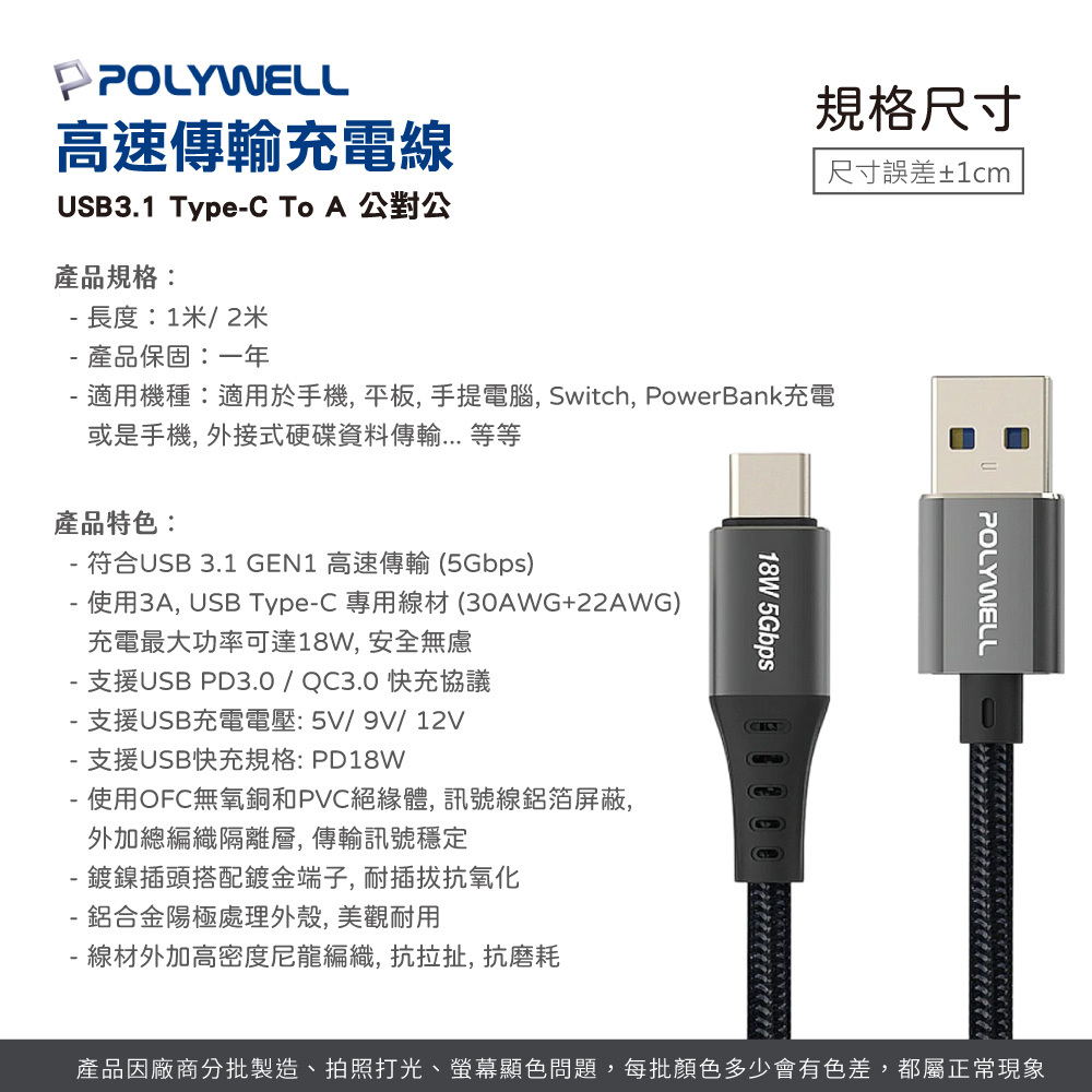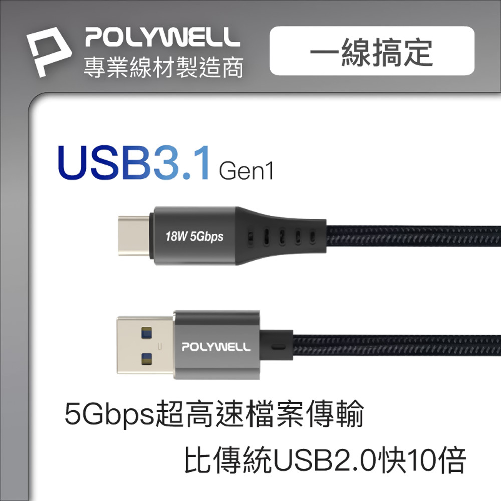 POLYWELL USB3.1 Type-C To A 公對公 高速傳輸充電線,