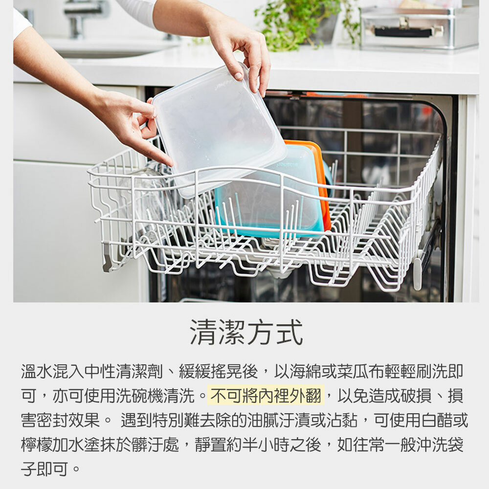 ●清潔方式:溫水混入中性清潔劑、緩緩搖晃後,以海綿或菜瓜布輕輕刷洗即可,亦可使用洗碗機清洗。不可將內裡外翻,以免造成破損、損害密封效果。 遇到特別難去除的油膩汙漬或沾黏,可使用白醋或檸檬加水塗抹於髒汙處,靜置約半小時之後,如往常一般沖洗袋子即可。