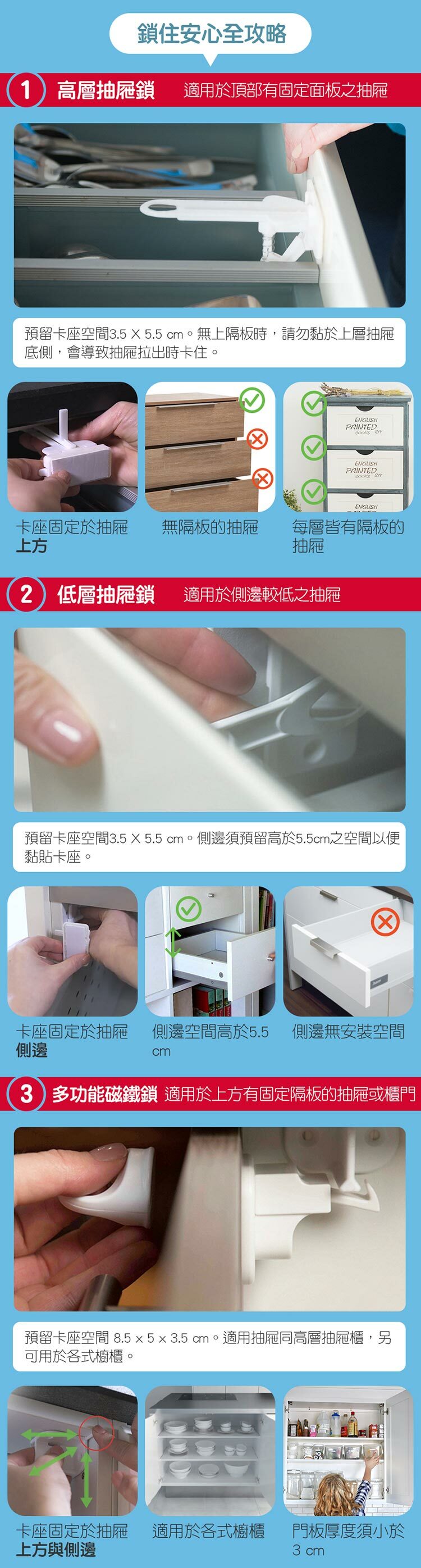 ✔適用於上方有固定隔板或櫃門的傢俱