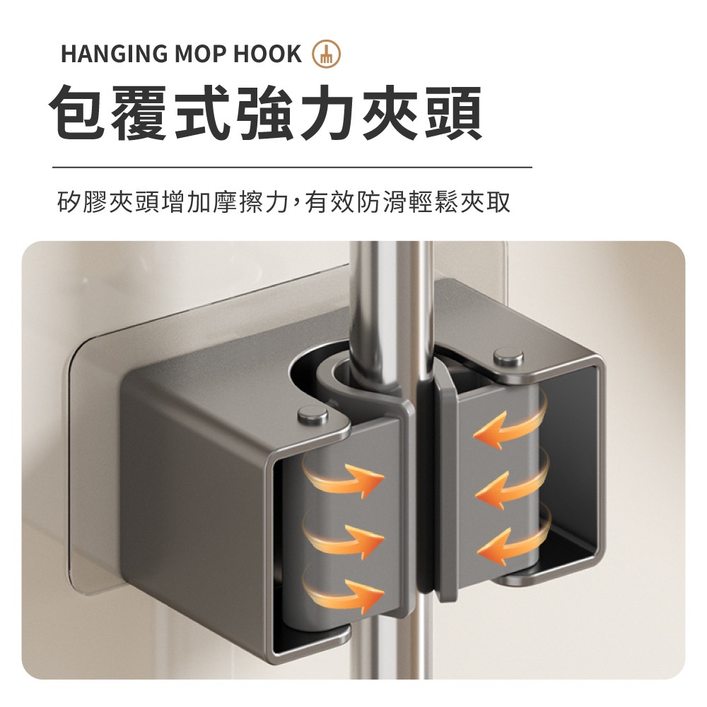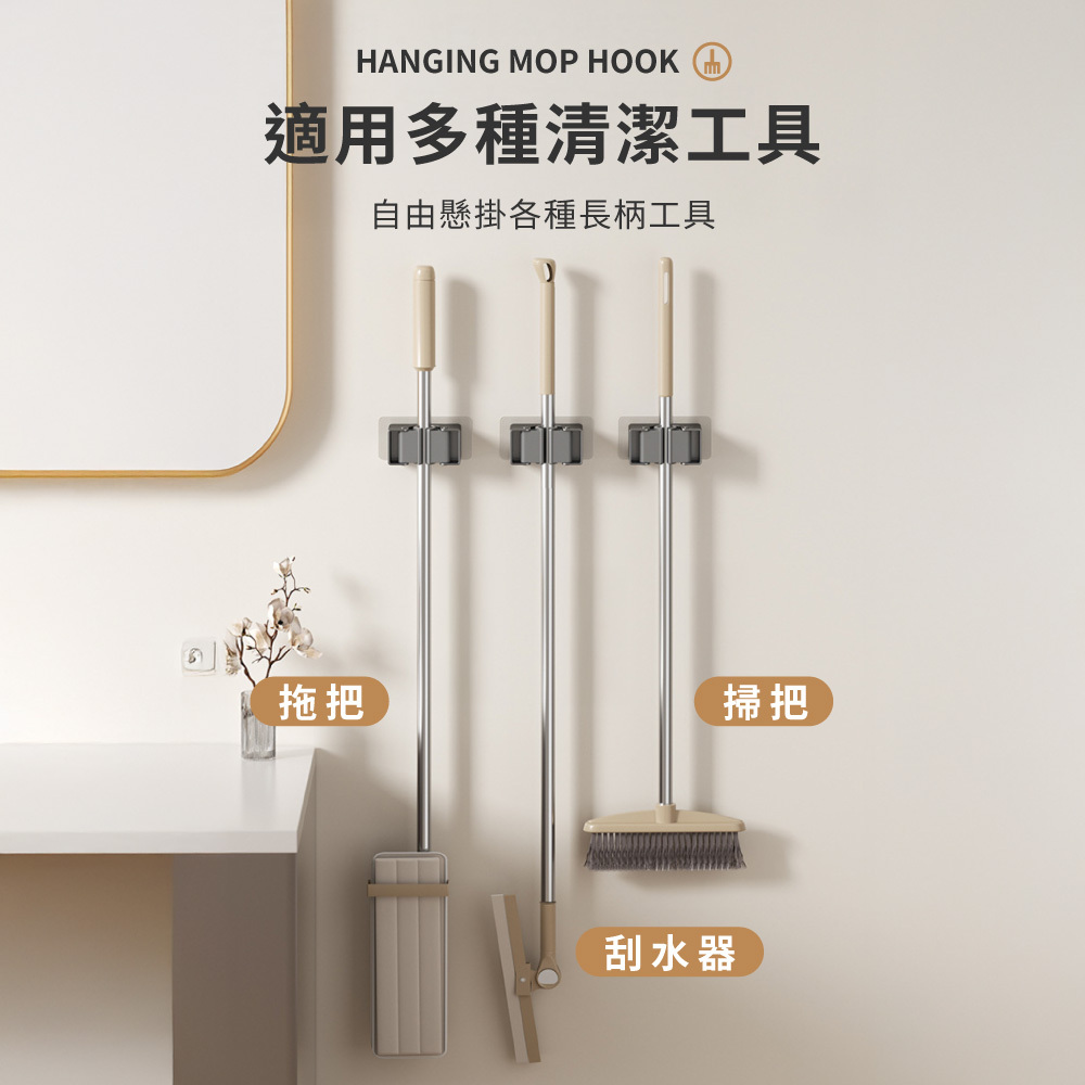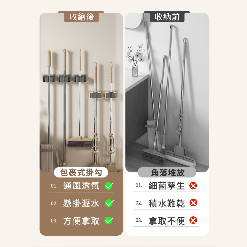 3.多用途收納:合拖把、掃把、刮水器等長柄工具。