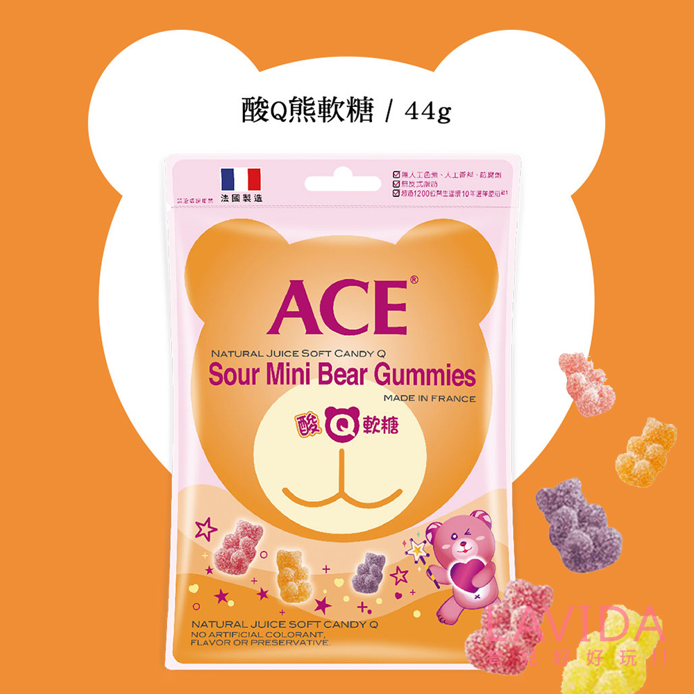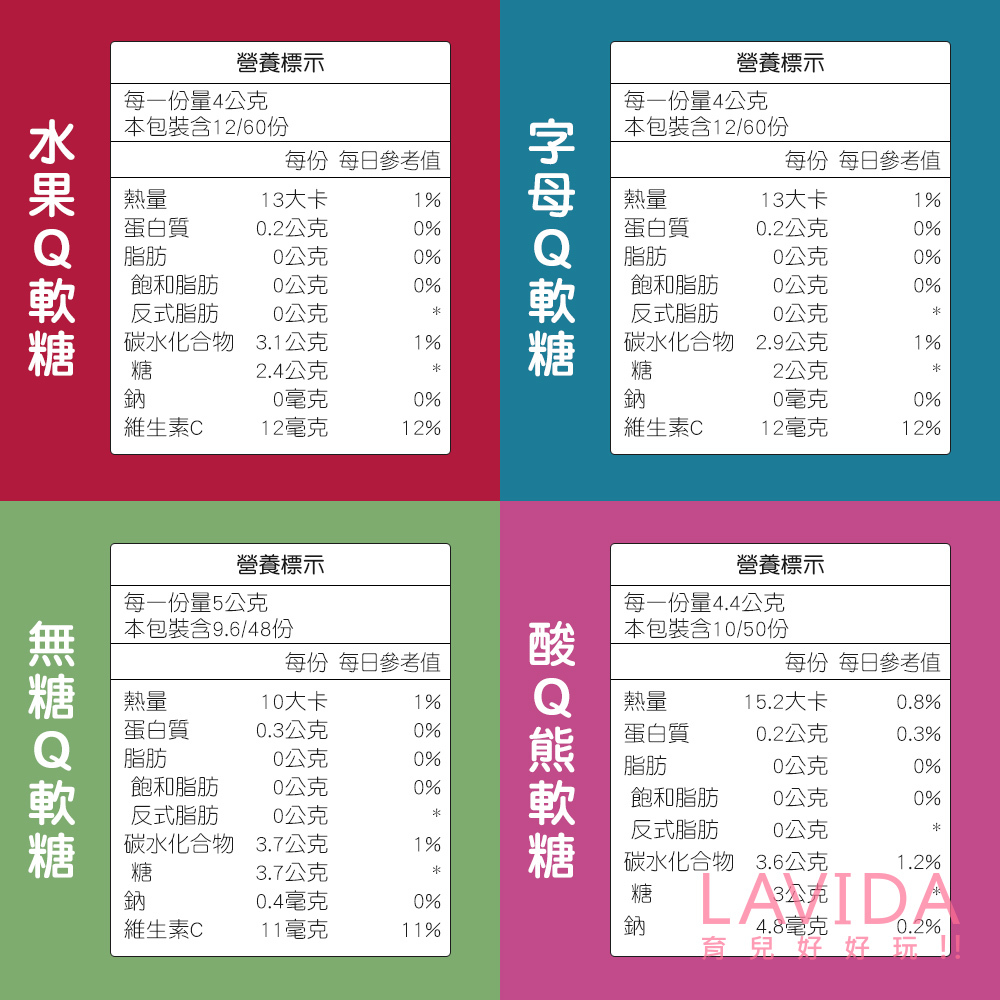成分:葡萄糖漿、甜菜糖、明膠、水、檸檬酸、DL-蘋果酸、DL-蘋果酸鈉、胡蘿蔔濃縮汁、南瓜濃縮汁、蘋果濃縮汁、紫蘿蔔濃縮汁、檸檬濃縮汁、藍藻濃縮汁、黑醋栗縮汁、天然香料、(柳橙、檸檬、黑醋栗)