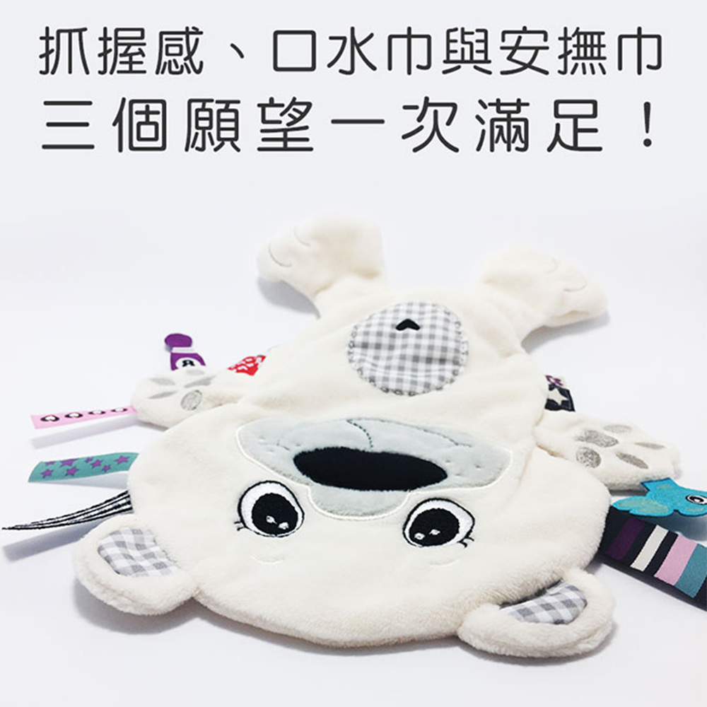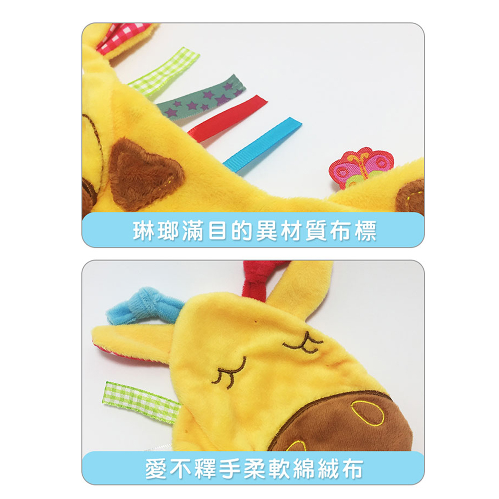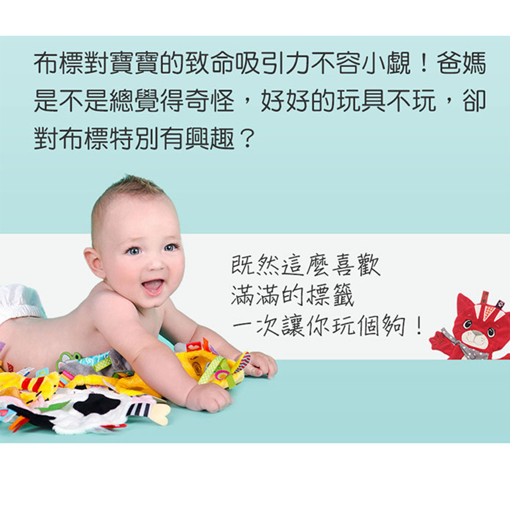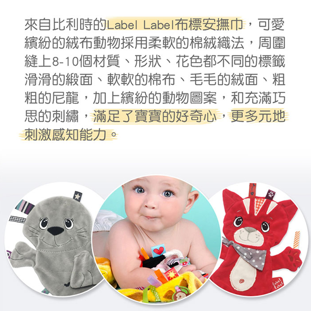 來自比利時的Label Label布標安撫巾,可愛繽紛的絨布動物採用柔軟的棉絨織法,周圍縫上8-10個材質、形狀、花色都不同的標籤滑滑的緞面、軟軟的棉布、毛毛的絨面、粗 粗的尼龍,加上繽紛的動物圖案,和充滿巧思的刺繡,滿足了寶寶的好奇心,更多元地刺激感知能力。