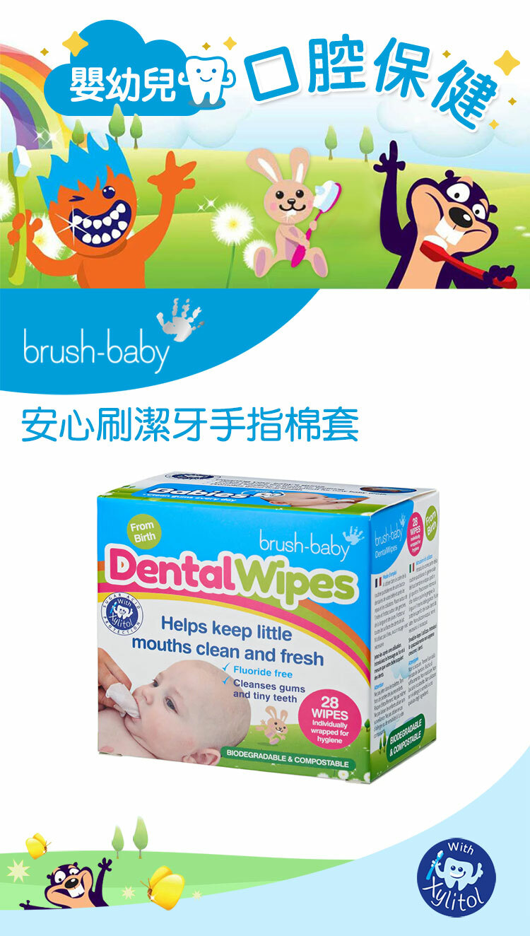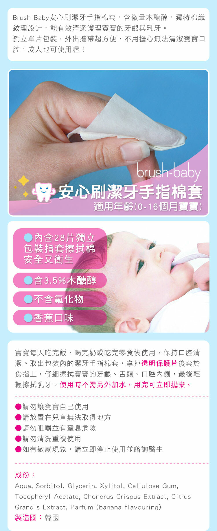取出包裝內的潔牙手指棉套,拿掉透明保護片後套於食指上,仔細擦拭寶寶的牙齦、舌頭、口腔內側,最後輕輕擦拭乳牙。使用時不需另外加水,用完可立即拋棄。