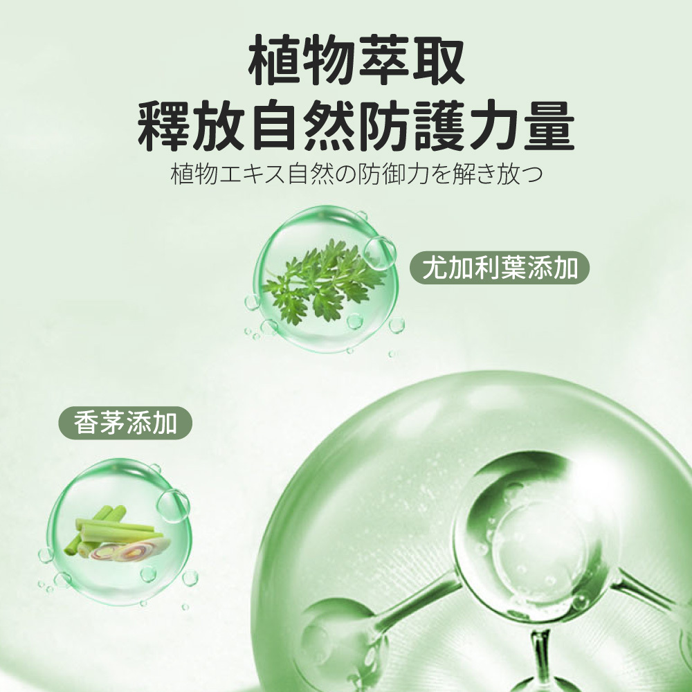 添加尤加利葉、香茅等精油成分,溫和無害,驅蚊同時散發清新香氣。