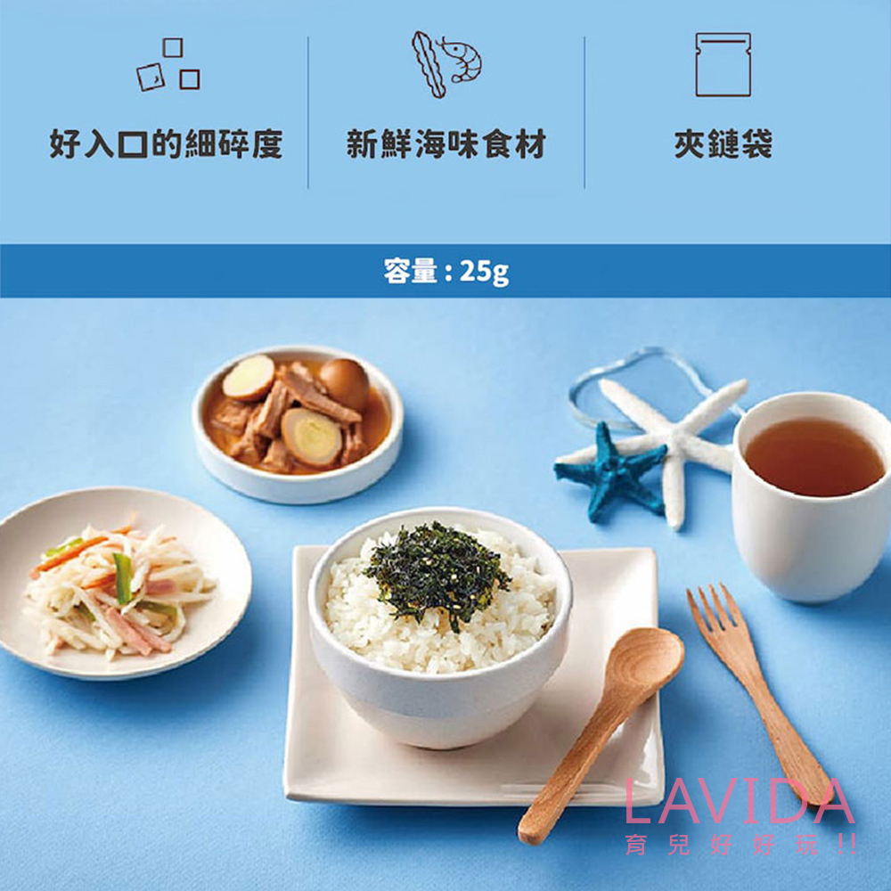 ▹海味蔬菜→葵花油、海苔、芝麻、糖、芝麻油、紅蘿蔔粉、白菜、南瓜、小銀魚、醬油粉{麥芽糊精、醬油(大豆、小麥、鹽、水)}、大豆粉、蝦