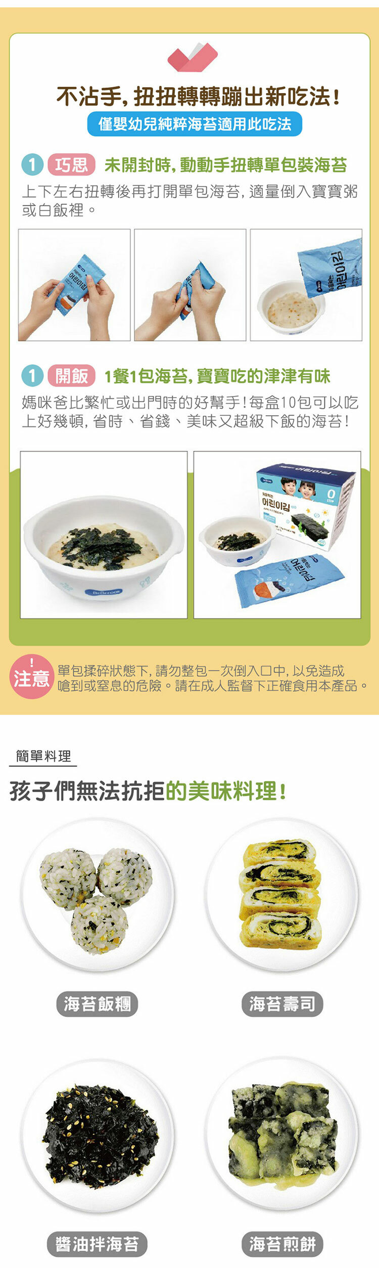 1.爸媽應讓孩子坐著食用幼兒海苔,並陪同孩子一起食用,確保安全。