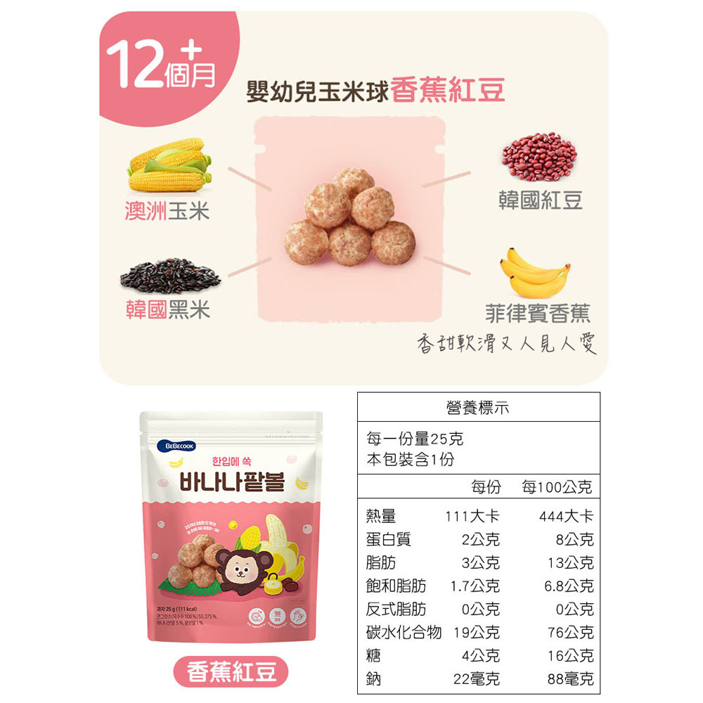▹香蕉紅豆→玉米粒、玉米球調味(糖、可可脂、奶粉、可可粉、大豆卵磷脂)、 香蕉粉、紅豆粉、黑米、糖、鹽