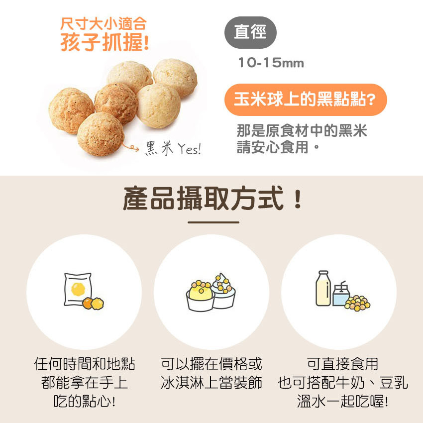 2. 玉米球可放室溫保存,但請勿放置濕度高的地方,拆封後請盡快食用完。