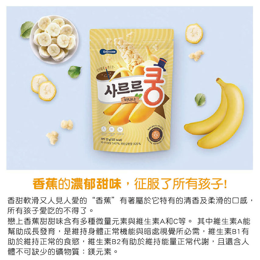 玉米粉、高油酸葵花籽油、 糖、 香蕉粉、 益生菌(雙歧桿菌、長雙歧桿菌、嗜酸乳桿菌、麥芽糖糊精)、海鹽、 海苔粉