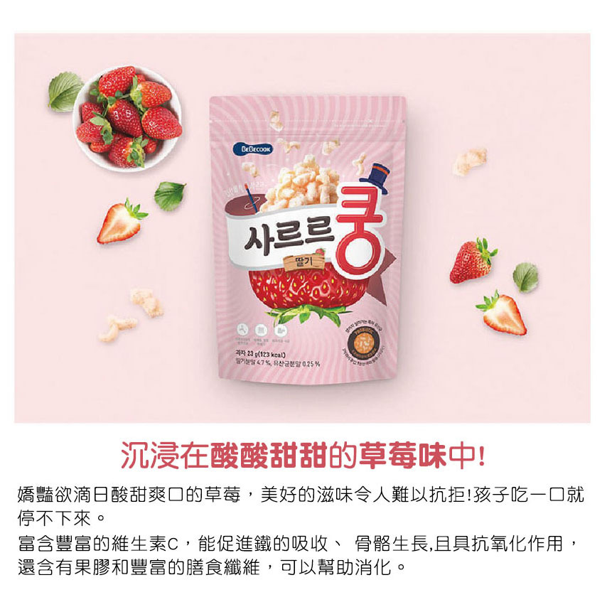 玉米粉、高油酸葵花籽油、 糖、 草莓粉、 益生菌(雙歧桿菌、長雙歧桿菌、嗜酸乳桿菌、麥芽糖糊精)、 海鹽、 海苔粉