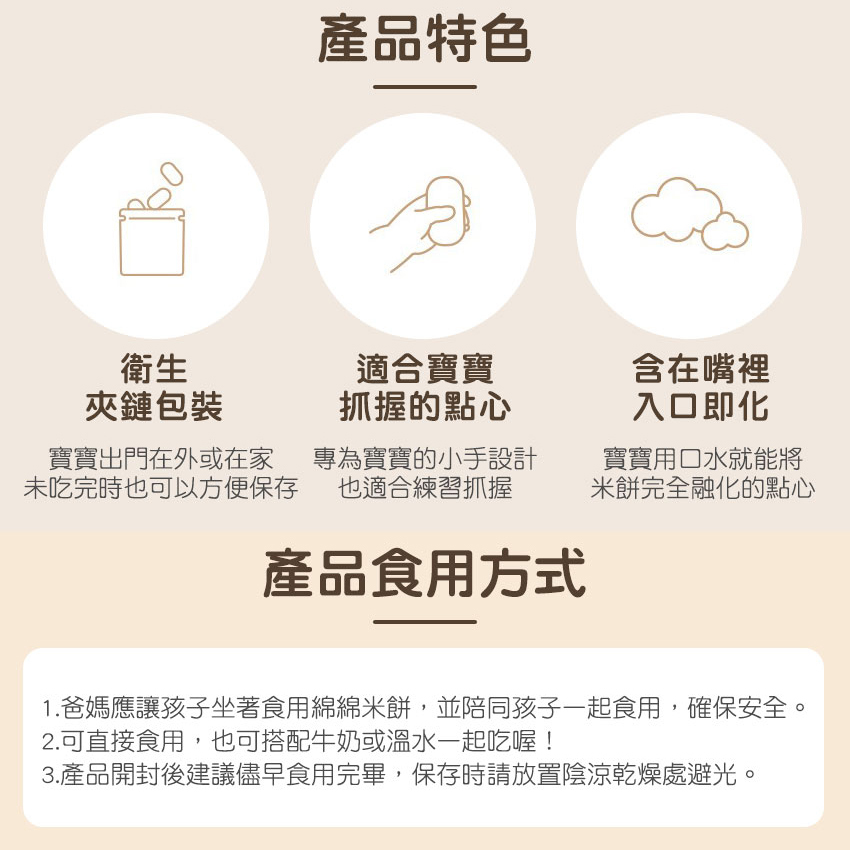 1.爸媽應讓孩子坐著食用綿綿米餅,並陪同孩子一起食用,確保安全。