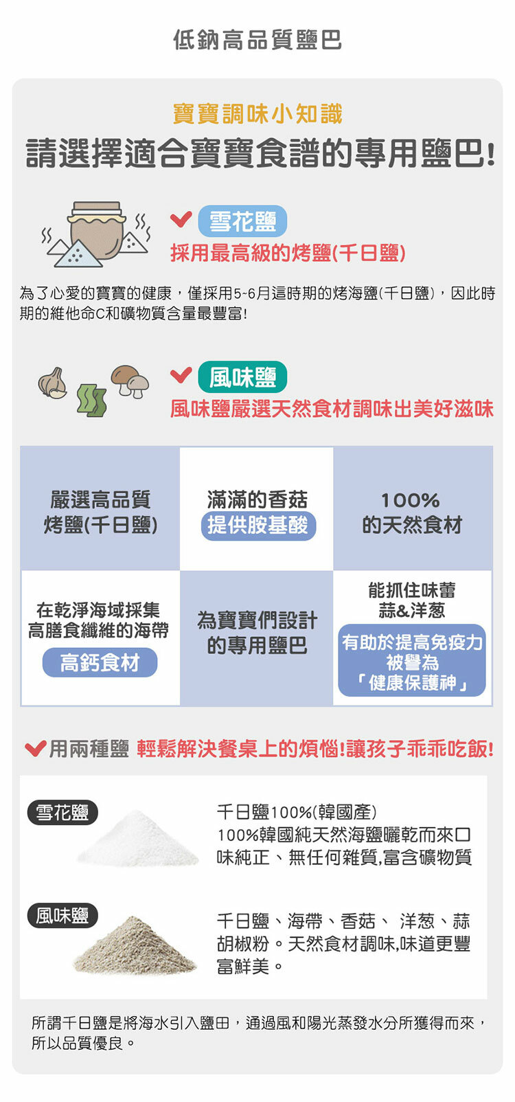 →純天然海鹽曬乾而來並含有豐富礦物質的鹽巴,是專為媽咪爸比們料理把關的萬能小幫手。使用了韓國產的海帶、香菇、洋葱等天然食材提味而減少鈉含量的幼兒專用鹽。 一瓶料理鹽,小菜、湯品等料理,通通都輕鬆搞定!