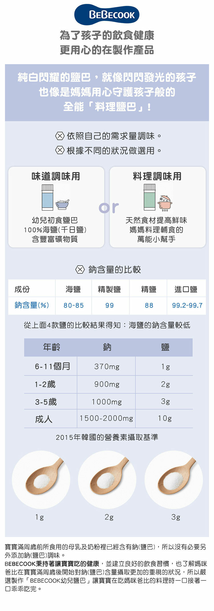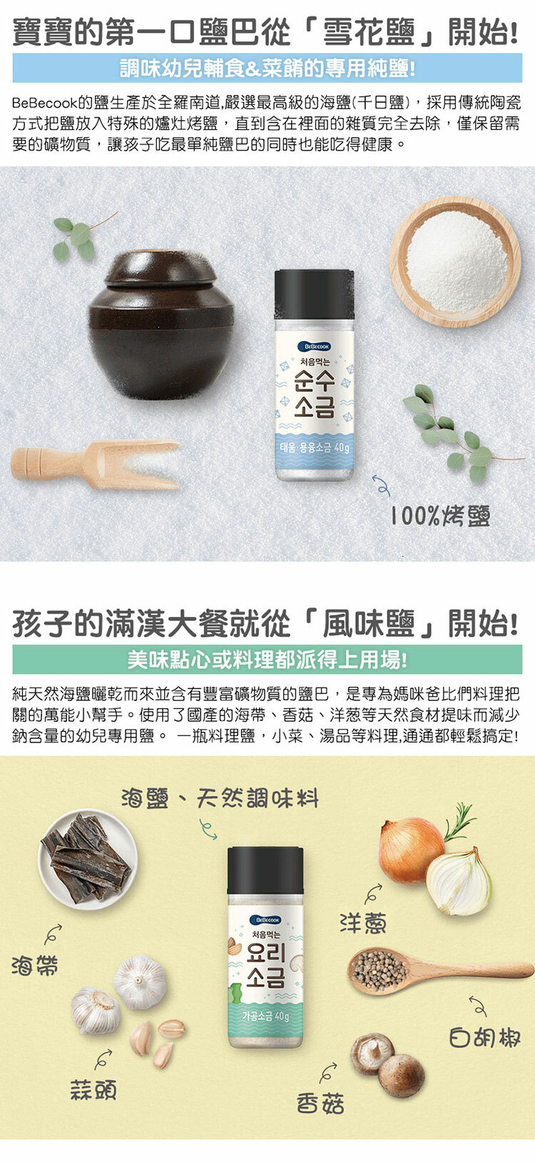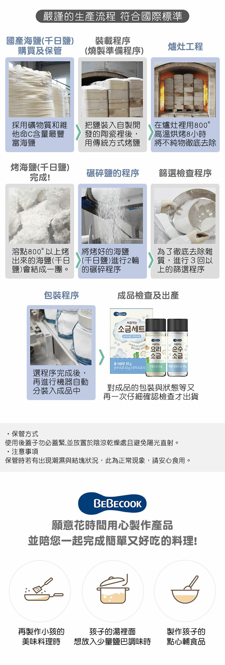 →BeBecook的鹽生產於韓國全羅南道,嚴選最高級的海鹽(千日鹽),採用傳統陶瓷 方式把鹽放入特殊的爐灶烤鹽,直到含在裡面的雜質完全去除,僅保留需要的礦物質,讓孩子吃最單純鹽巴的同時也能吃得健康。