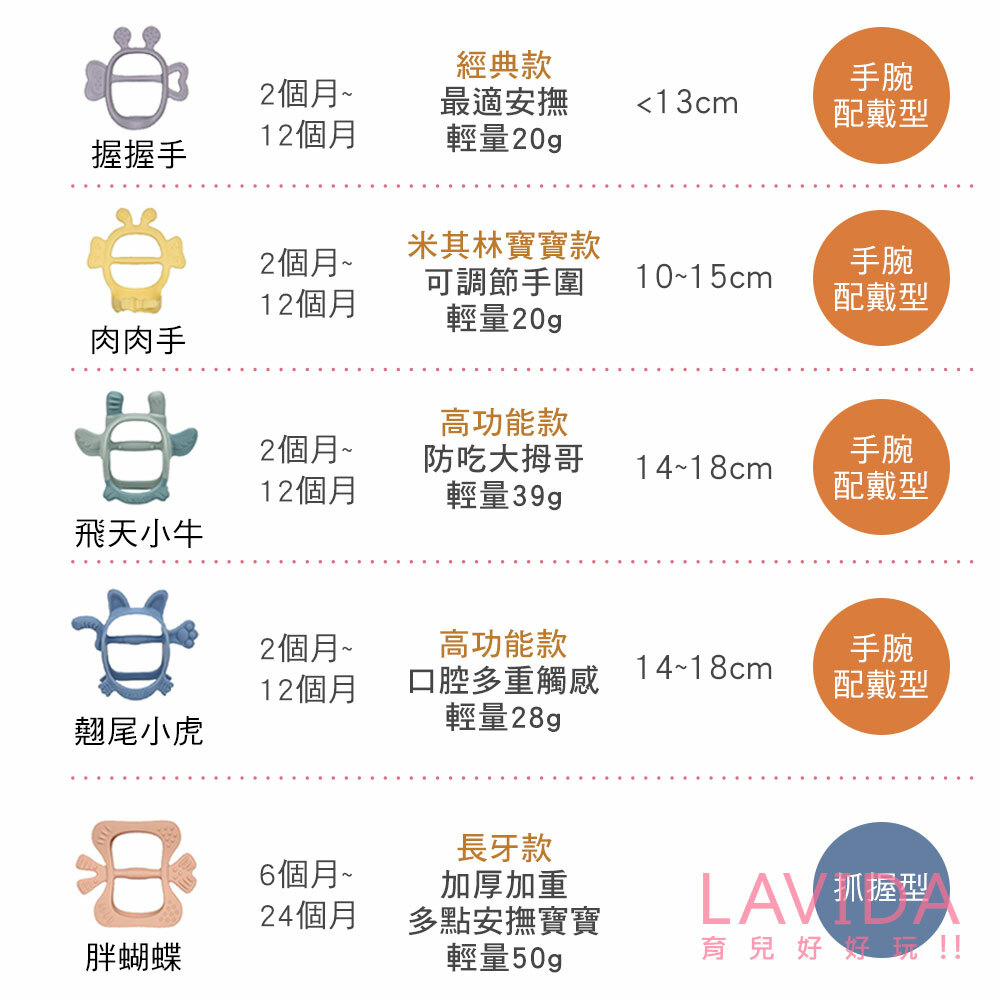 A6:胖蜜蜂系列的固齒器,皆可套入寶寶的手腕,讓固齒器不會隨著寶寶鬆開的雙手掉落地上,因此建議使用胖蜜蜂系列。
